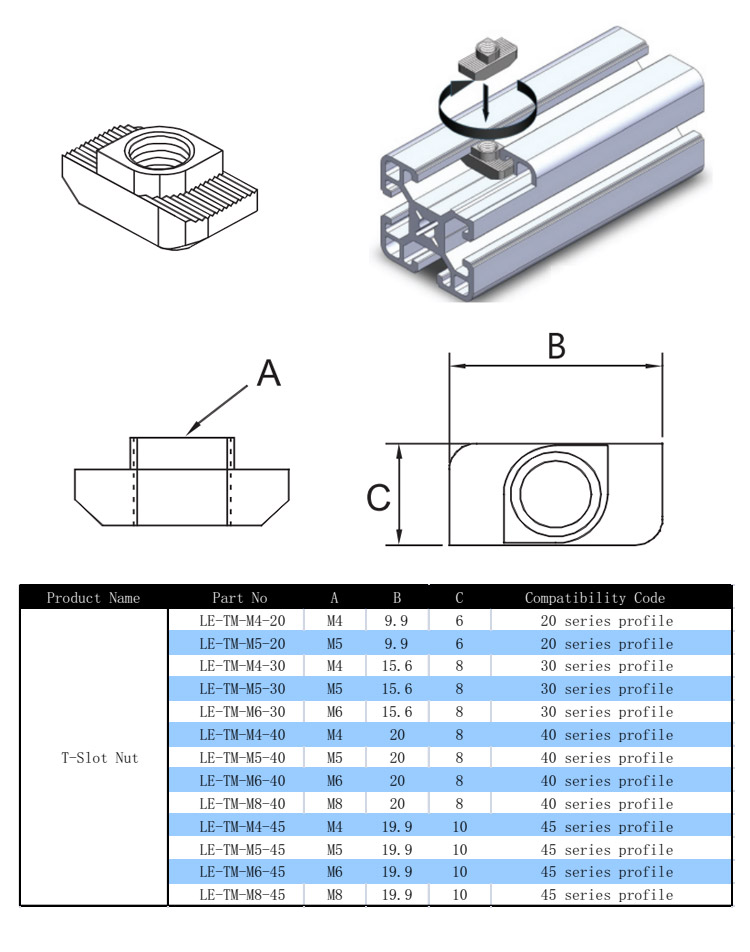 Stosowanie:Nakrętka T jest prosta w użyciu i wygodna do podłączenia aluminiowych profili z innymi częściami.